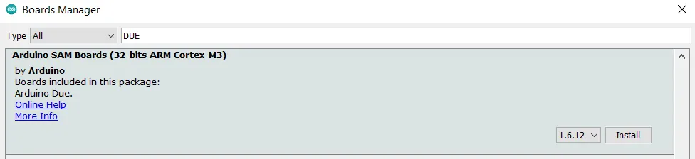 Type DUE in the search bar and install the latest version of Arduino SAM Boards (32-bits ARM Cortex-M3).