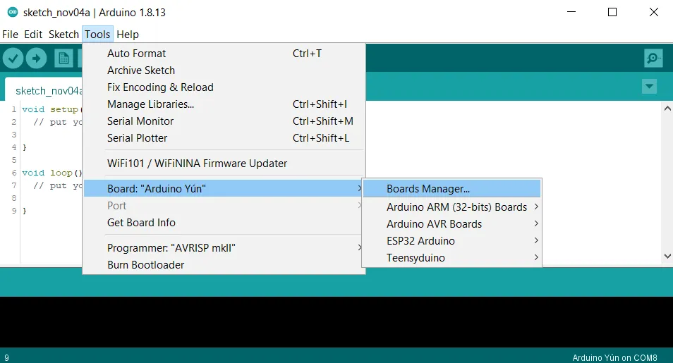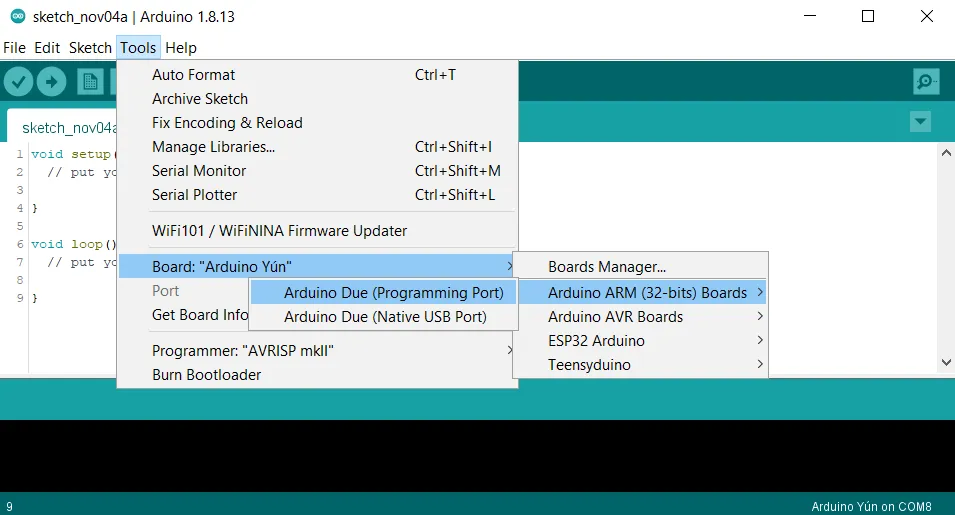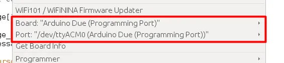 • Go to: Tools -> Board -> Arduino ARM (32-bits) Boards and choose Arduino Due (Programming Port)