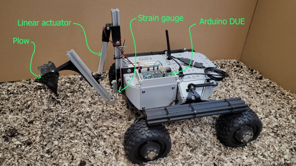 The Plow is connected to the rest of the rover with a strain gauge beam. Pulling force can be observed as tiny changes in voltage, that get amplified with an amplifier. Arduino is used to gather the data and send it to the computer.