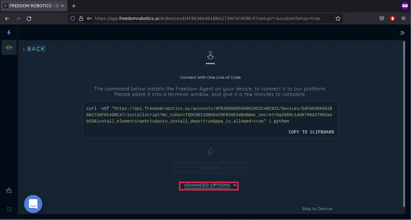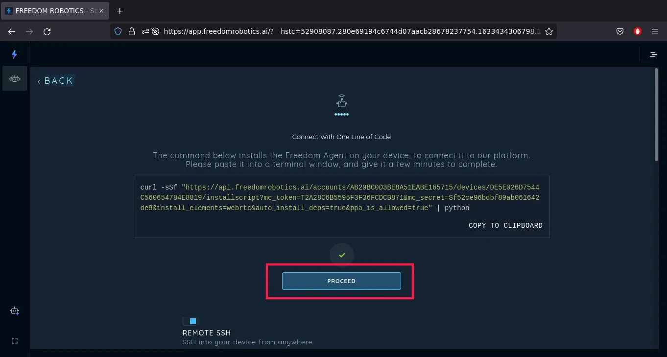 No matter what option you chose, the next step is the same. After a short time, we get a custom curl command that will install the Freedom Robotics agent when executed on our rover.