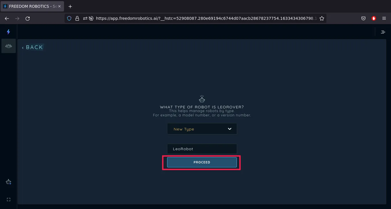 will continue with LeoRover. Enter your robot's name and click the PROCEED