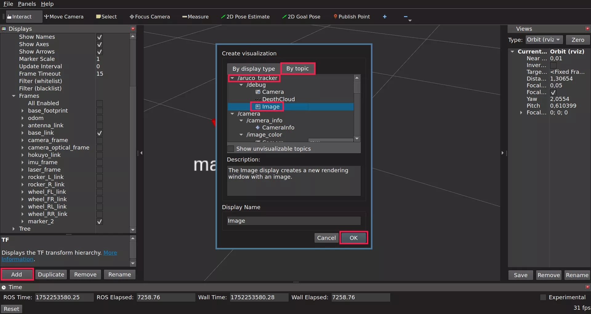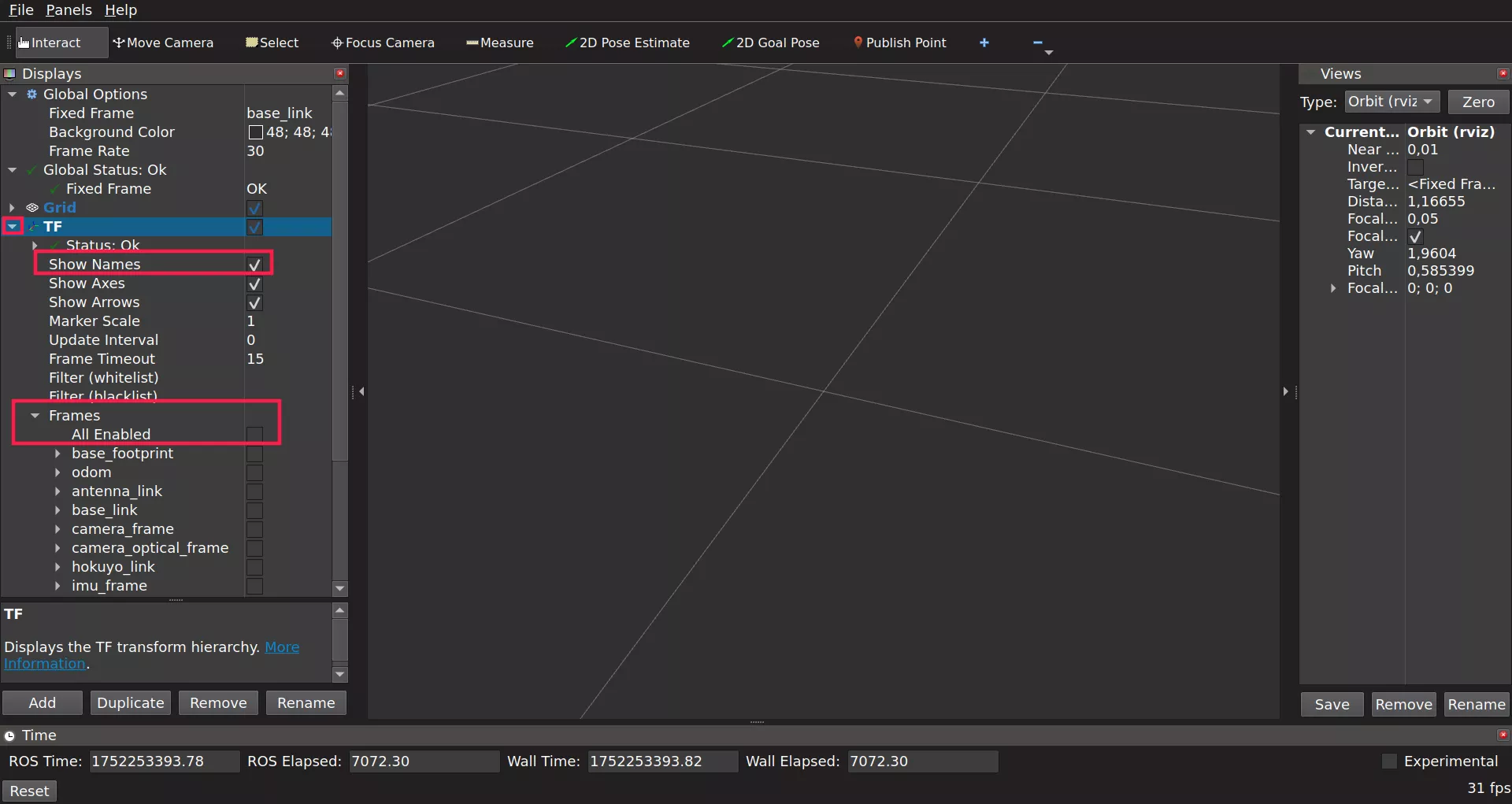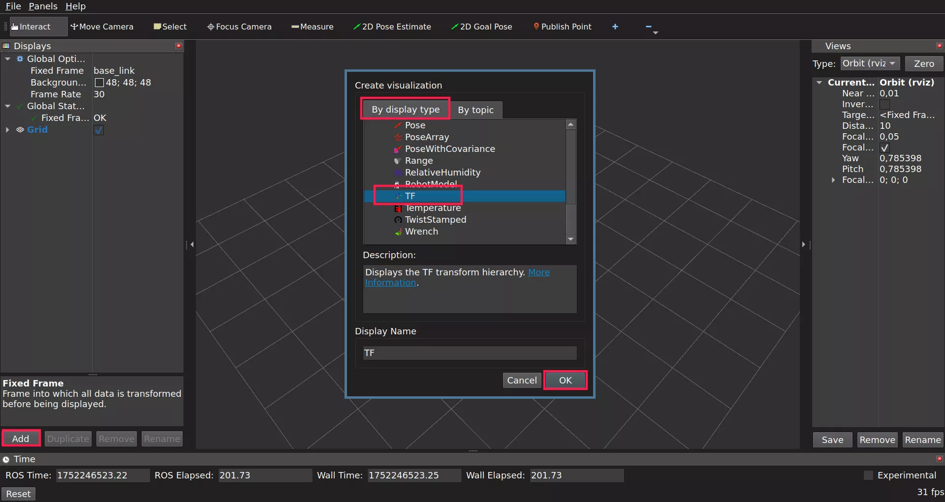 Open RViz by typing rviz2 in the terminal and set Fixed Frame to base_link.