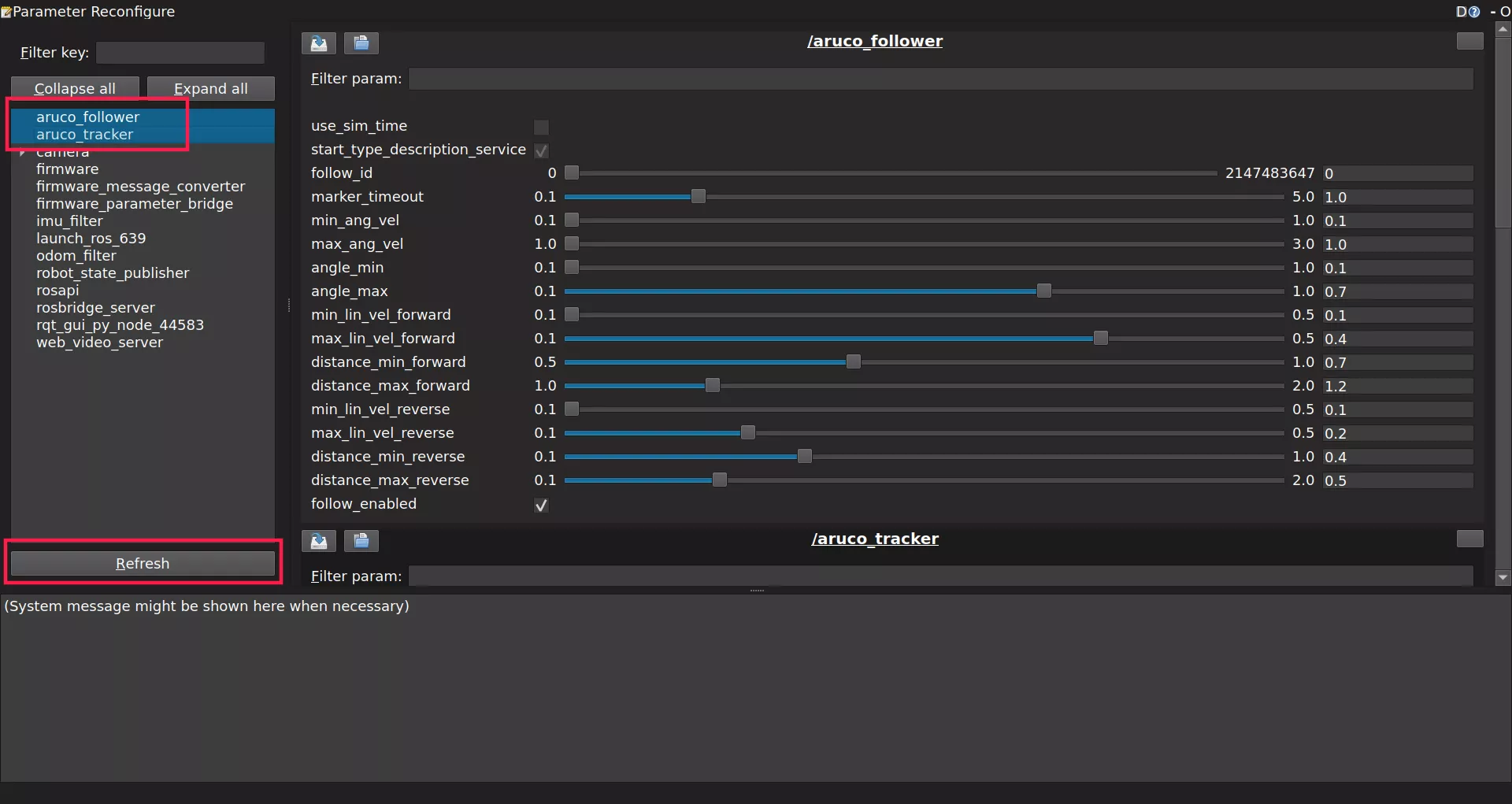 All nodes launched in the example have configurable parameters, therefore it's easy to adjust the system for your conditions. To be able to change anything you need to have ROS installed on your computer and be connected to the rover's network.